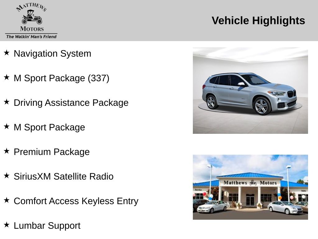 **Save time, Buy Online with Matthews Motors Express Point.Click.Buy**We have over 300 certified pre-owned vehicles, most come with a lifetime powertrain, engine and transmission warranty. There's a variety of reasons why our customers continue to return to our 4 conveniently located showrooms throughout North Carolina. Which are a few of the reasons we have been awarded CIADA Quality Dealer of The Year and the BBB Torch Award Winner. Here at Matthews Motors we're committed to providing the ultimate automotive dealership experience.Aerodynamic Kit, Alum Hexagon Trim w/Estoril Blue Matte Highlight, Ambient Lighting, Auto-Dimming Interior & Driver Exterior Mirrors, Auto-Dimming Rear-View Mirror, Comfort Access Keyless Entry, Driving Assistance Package, High-Gloss Roof Rails, LED Headlights w/Cornering Lights, Lumbar Support, M Sport Package, M Sport Package (337), M Sport Suspension, M Steering Wheel, Navigation System, Panoramic Moonroof, Park Distance Control, Parking Assistant, Power Liftgate, Power-Folding Mirrors, Premium Package, Rear-View Camera, Shadowline Exterior Trim, SiriusXM Satellite Radio, Sport Seats, Universal Garage-Door Opener, Wheels: 18" x 7.5" Light-Alloy Double-Spoke, Without Lines Designation Outside.Odometer is 44920 miles below market average! 23/32 City/Highway MPG