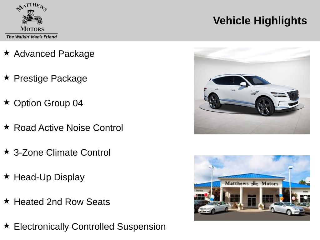 Discover the pinnacle of luxury and performance with this exceptional 2023 Genesis GV80 2.5T Prestige & Advanced Package. This stunning SUV is a true testament to the brand's commitment to excellence, blending cutting-edge technology, unparalleled comfort, and a commanding presence on the road.Meticulously equipped, this GV80 boasts an impressive array of premium features, including:- Prestige Package- Advanced Package- Road Active Noise Control- 3-Zone Climate Control- Head-Up Display- Heated 2nd Row Seats- Electronically Controlled Suspension- 12.3" 3D Digital Instrument Cluster- Forward Attention Warning- Ergo Motion Driver Seat- Power Cushion Extension & BolsterPowered by a robust 2.5L DOHC engine and paired with an 8-speed automatic transmission, this all-wheel-drive SUV delivers a dynamic and confident driving experience. With an EPA-estimated 20 city / 24 highway MPG, you'll enjoy exceptional efficiency without compromising performance.Step inside and be enveloped in the GV80's luxurious cabin, where premium materials and thoughtful design elements create an atmosphere of refined sophistication. The Lexicon premium audio system, with its 21 speakers and 1050 watts of power, will immerse you in a concert-hall-like soundscape, while the intuitive infotainment system with Apple CarPlay and Android Auto integration keeps you connected and in control.Safety is of the utmost importance, and the GV80 delivers with a comprehensive suite of advanced driver-assistance features. From Blind-Spot View Monitor and Parking Collision-Avoidance Assist to the Surround View Monitor and Remote Smart Parking Assist, this SUV is designed to provide you and your loved ones with the ultimate peace of mind.Elevate your driving experience and make a lasting impression with this exceptional 2023 Genesis GV80 2.5T Prestige & Advanced Package. We invite you to visit our showroom and experience the unparalleled craftsmanship and performance that this remarkable SUV has to offer. Let us help you discover the true luxury and capability that the GV80 can bring to your life.