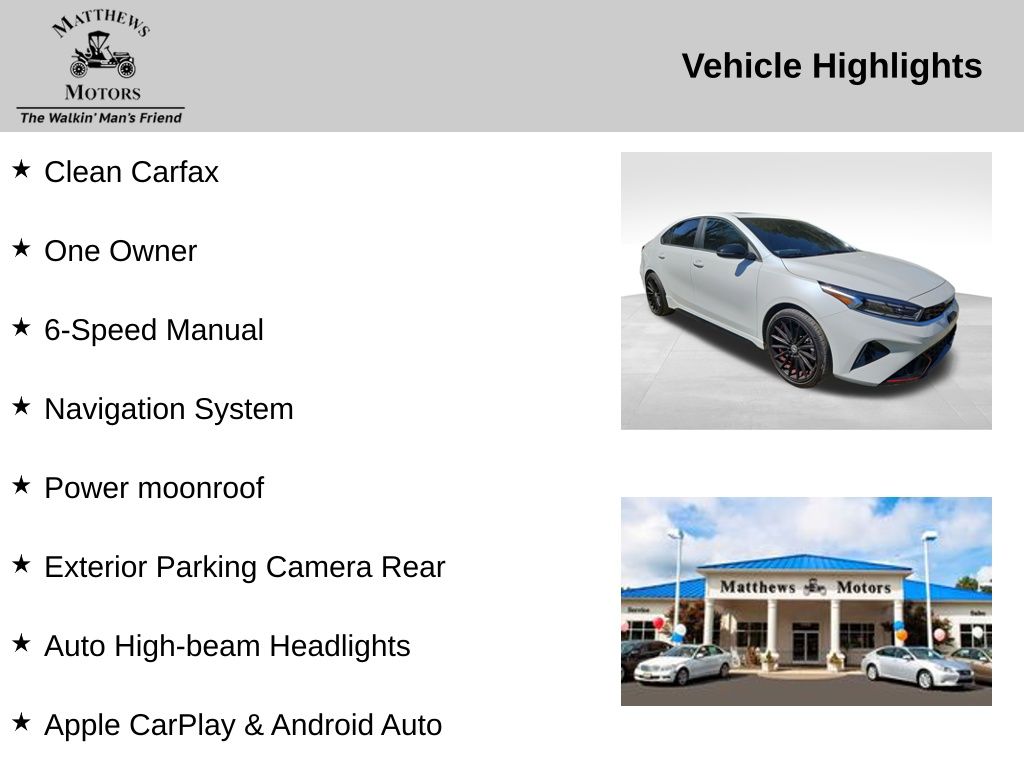 **Save time, Buy Online with Matthews Motors Express Point.Click.Buy**We have over 300 certified pre-owned vehicles, most come with a lifetime powertrain, engine and transmission warranty. There's a variety of reasons why our customers continue to return to our 4 conveniently located showrooms throughout North Carolina. Which are a few of the reasons we have been awarded CIADA Quality Dealer of The Year and the BBB Torch Award Winner. Here at Matthews Motors we're committed to providing the ultimate automotive dealership experience.Clean Carfax, One Owner, 6-Speed Manual, Apple CarPlay & Android Auto, Auto High-beam Headlights, Exterior Parking Camera Rear, Navigation System, Power moonroof.CARFAX One-Owner. Clean CARFAX. 22/31 City/Highway MPG
