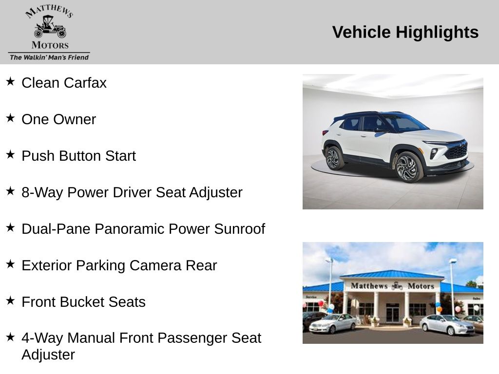 Discover the Epitome of Versatility and Style: The 2026 Chevrolet TrailBlazer RS Panoramic Sunroof with Convenience PackageAs you embark on your search for the perfect SUV, allow us to introduce you to the 2026 Chevrolet TrailBlazer RS Panoramic Sunroof with Convenience Package. This exceptional vehicle seamlessly blends cutting-edge technology, uncompromising comfort, and a commanding presence that will captivate you from the moment you lay eyes on it.- Clean Carfax- One Owner- Push Button Start- Panoramic Sunroof- Wireless Charging- Hands Free Power Programmable Liftgate- Lane Change Alert with Side Blind Zone Alert- Rear Cross Traffic Alert- Rear Park Assist- 8-Way Power Driver Seat Adjuster- Heated Driver and Front Passenger Seats- Dual-Pane Panoramic Power Sunroof- Alloy wheelsPowered by a 1.3L I3 Turbocharged DOHC 12V LEV3-SULEV30 engine, the TrailBlazer RS delivers an exceptional driving experience with an impressive 155 horsepower and a fuel-efficient CVT transmission. With an EPA-estimated 29 MPG in the city and 33 MPG on the highway, this SUV offers the perfect balance of performance and efficiency to meet your daily driving needs.Step inside the TrailBlazer RS and be captivated by the thoughtfully designed interior. The Convenience Package elevates your experience with features like automatic climate control, wireless charging, and a 120-volt power outlet, ensuring your every need is met. The Driver Confidence Package further enhances your peace of mind with advanced safety technologies, including Lane Change Alert with Side Blind Zone Alert, Rear Cross Traffic Alert, and Rear Park Assist.Comfort and style come together seamlessly in the TrailBlazer RS. The heated front seats and 8-way power driver's seat provide exceptional support and customization, while the dual-pane panoramic sunroof floods the cabin with natural light, creating a truly inviting atmosphere. The alloy wheels add a touch of sophistication to the exterior, complementing the Beige exterior color and Iridescent Pearl Tricoat accents.Whether you're embarking on a family adventure, navigating the daily commute, or seeking a versatile companion for your active lifestyle, the 2026 Chevrolet TrailBlazer RS Panoramic Sunroof with Convenience Package is the perfect choice. Experience the epitome of utility, technology, and style by scheduling a test drive today. We're confident you'll be captivated by this exceptional SUV.