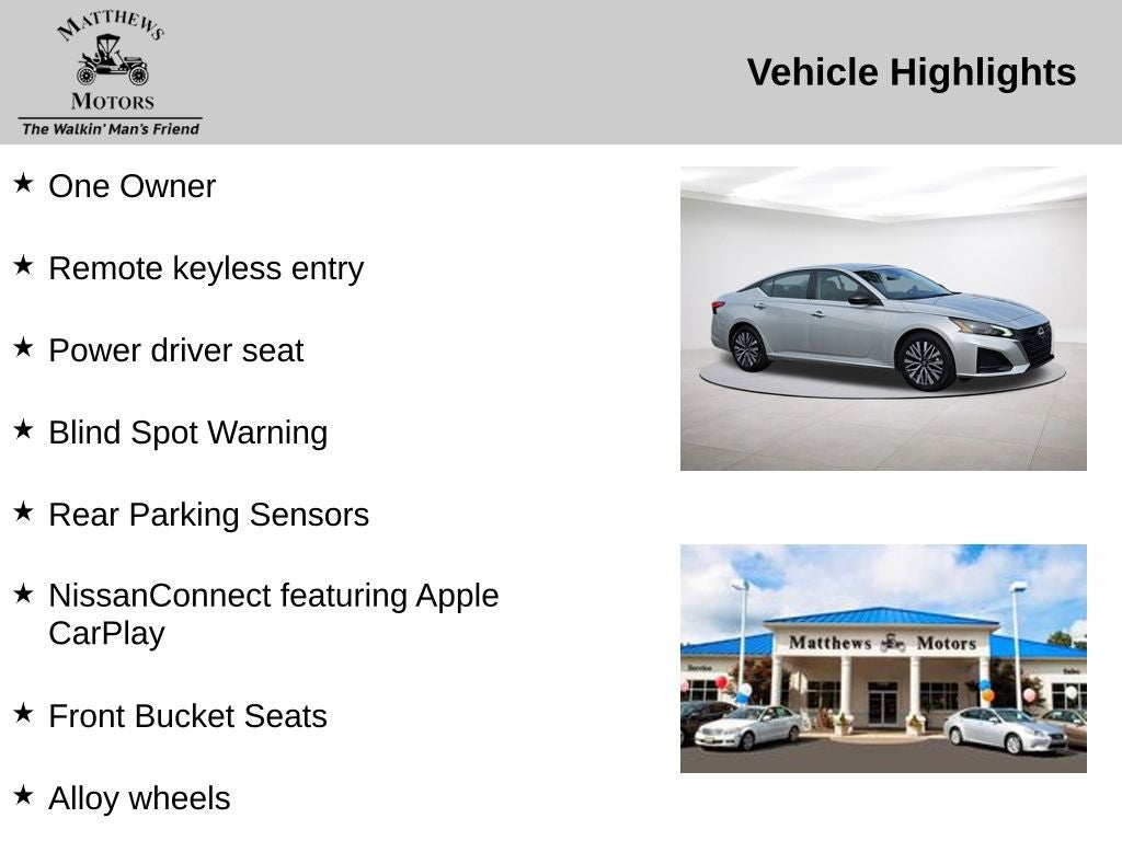 One Owner, CVT with Xtronic, Alloy wheels, Blind Spot Warning, Front Bucket Seats, NissanConnect featuring Apple CarPlay, Power driver seat, Rear Parking Sensors, Remote keyless entry.